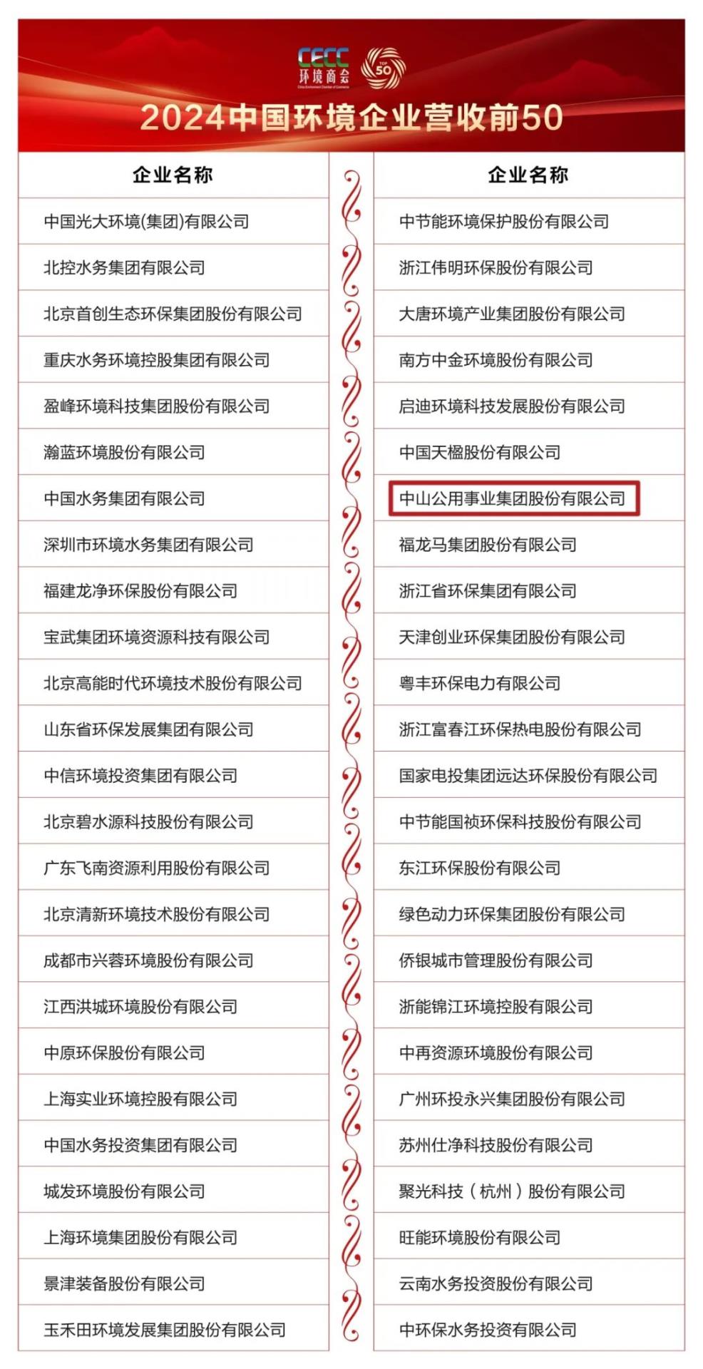 此次榮登“2024中國環(huán)境企業(yè)營收前50”榜單,是對中山公用過往成績的高度認(rèn)可,也是對未來發(fā)展的有力鞭策。